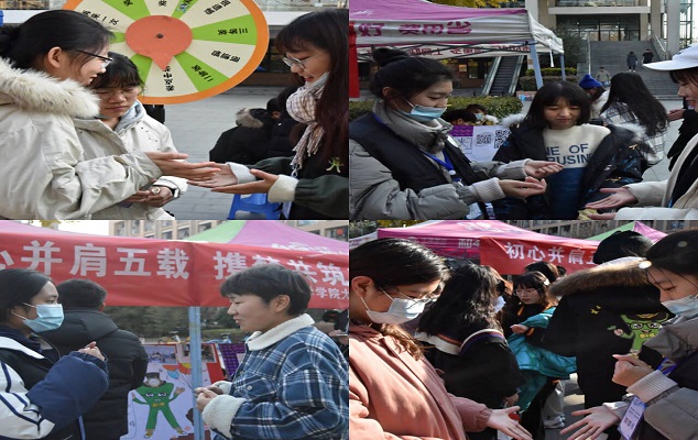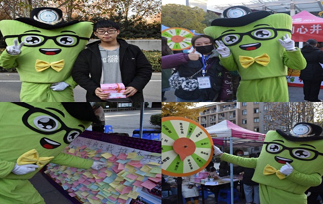 本次活动采用“线上和线下”相结合的方式 ,面向全校师生开展。线下活动前,通过樱花动漫 官方QQ、微信公众号集赞兑换奖品与微博评论抽奖的方式进行线上预热宣传;线下活动则由记者团成员通过趣味小游戏、“幸运大转盘”、留言板等方式与同学们面对面互动,参与者关注樱花动漫 官方微博、微信公众号、QQ,与记者团成员进行趣味小游戏胜利后,即有机会转动大转盘获得精美礼品一份。活动期间,现场气氛热烈,在解释游戏规则后,同学们纷纷摩拳擦掌、跃跃欲试,热情高涨地与记者团成员进行游戏。游戏过程中,穿着玩偶服的“X先生”也惊喜亮相,吸引了众多同学,在现场与大家进行亲密互动并合影留念。最后,同学们把自己对生命大学生记者团五周年的祝福及自己对未来的美好希冀写在留言板上,积极向上的青春风貌与生命大学生记者团的激扬活力交织在一起,欢声笑语的场面成为校园里的一道靓丽风景线。