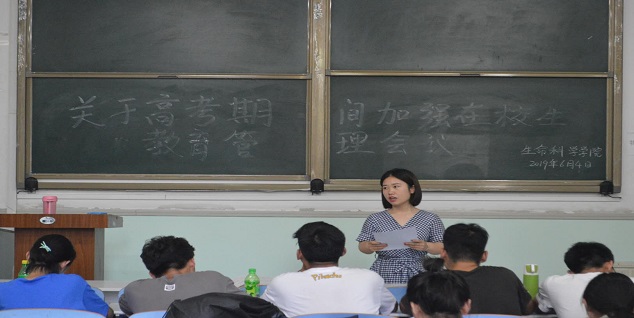 首先,院团委老师张晶详细宣读了《关于高考期间加强高校在校学生管理的通知》,重点强调了替考等高考作弊的后果,对违规学生要给予开除学籍处理并依法追究刑事责任,提高学生的思想认识。然后,针对高考期间学生管理展开具体的指导和部署:落实建立学生假期离校请假制度;要求全体学生填写假期去向表;在校生在高考时间段内在学院设立的签到点进行签到;离校生履行正常请假手续并签订学生高考期间离校承诺书。学院团委严格落实请假、签到等流程,杜绝代替请假、代替签到等行为。同时通过定点、定时通信等灵活多样、切实有效措施,实时掌握考试时间内学生所处位置和状态,对离校者、通信不畅者、去向可疑者核清原因,深查细纠,坚持在防范化解学生替考问题上出实招、出硬招。会上,学生们纷纷表示会与高考考生划清界线,绝不发生替考等违规行为。