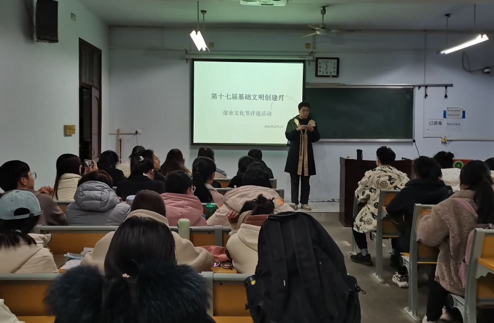 11月15日起,学院各班级组织开展“博雅修身,厚德端行”主题班会,以“学风建设、争先创优、宿舍安全文明”为核心思想,传达并学习学院“大学生基础文明创建月”活动内容。11月24日,学院开展“宿舍卫生大比拼”、“宿舍美化大赛”、“创意宿舍名称”和“创意宿舍logo”等评选活动,微信投票结果共有10个宿舍脱颖而出进入本次宿舍文化节的最终评比。