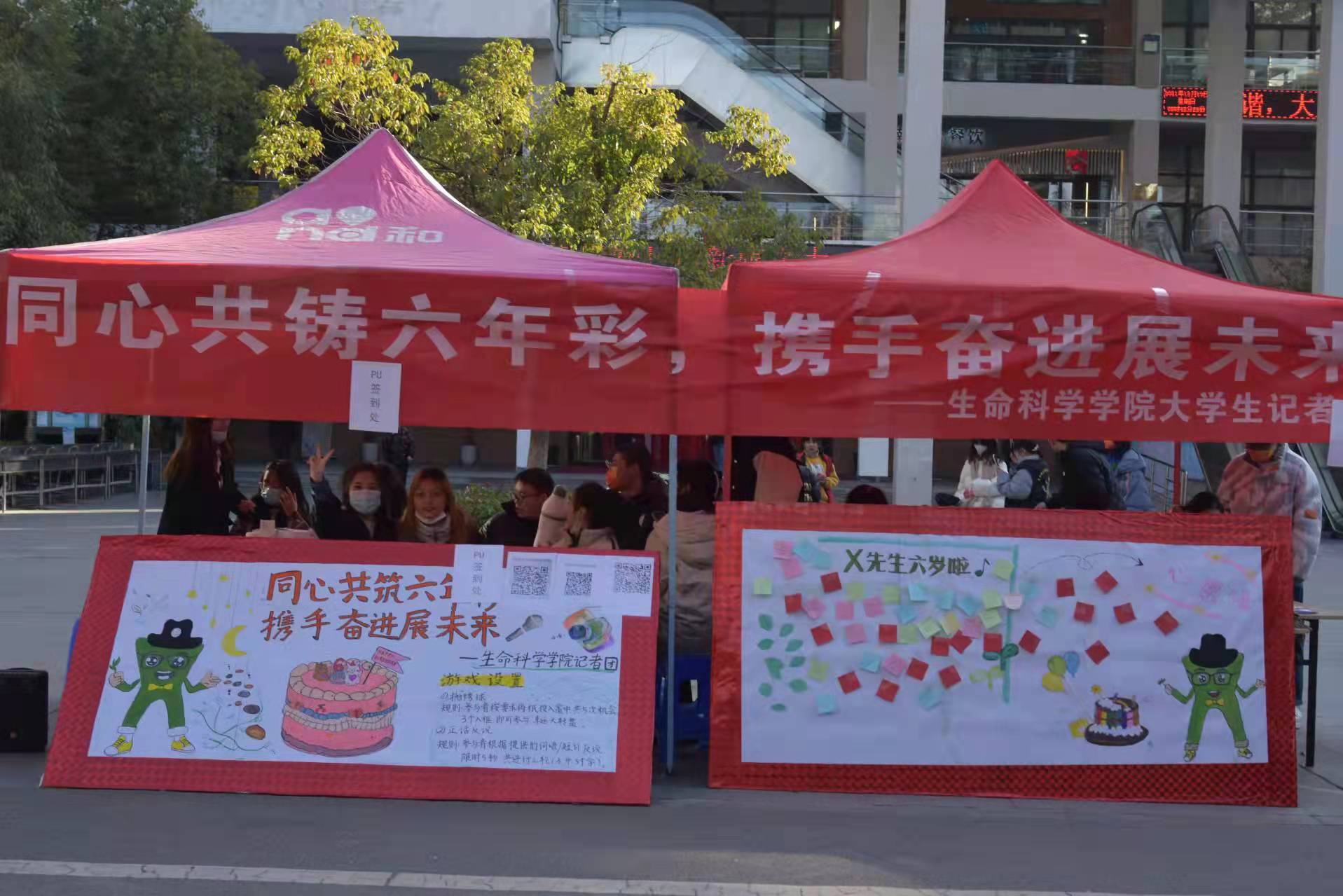 此次周年庆以“同心共铸六年彩,携手奋进展未来”为主题,由院记者团主办,活动面向全校师生,有线上和线下两种方式。线上参与活动者,凭转发樱花动漫 官方QQ、微信、微博活动预热推文的集赞数或抽奖结果兑换奖品。线下活动由趣味小游戏“抛绣球”、“幸运大转盘”、留言板等部分组成,参与者完成挑战即可现场抽取奖品。穿着玩偶服的“X先生”活跃在现场,吸引同学们驻足围观互动,现场气氛热烈。此次活动在同学们真挚的祝福留言中圆满结束。
