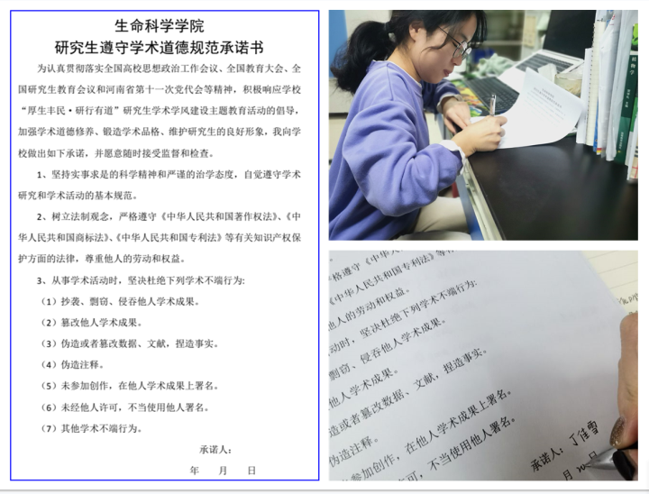 同时,学院通过新媒体公众号“X先生”发布倡议书,研究生其他年级也通过主题党日、团日活动,开展科学道德与学风建设主题教育,积极签署《学术道德规范承诺书》。