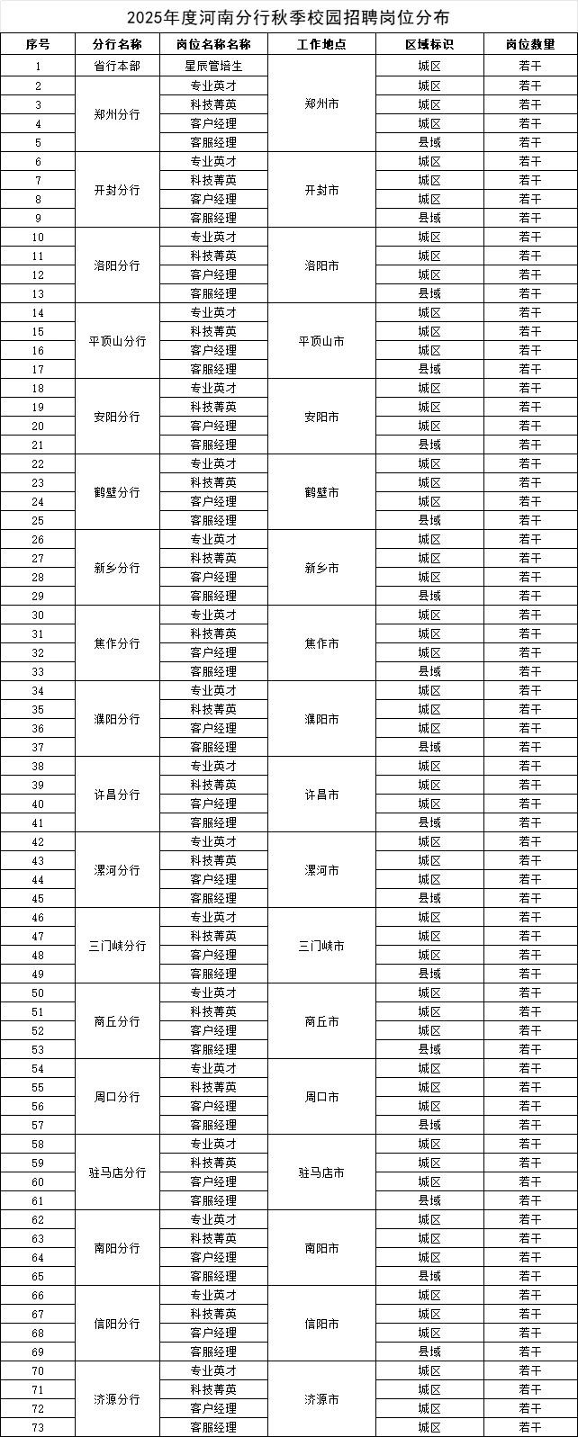 在郑州、开封、洛阳、平顶山、安阳、鹤壁、新乡、焦作、濮阳、许昌、漯河、三门峡、商丘、周口、驻马店、南阳、信阳和济源18家地市分行的辖属支行工作。