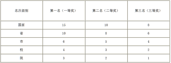 (1)参加国家、省、市、校、院举办的学习及科技作品竞赛(大赛),为校、院争得荣誉以及取得名次者,按下列标准计分。