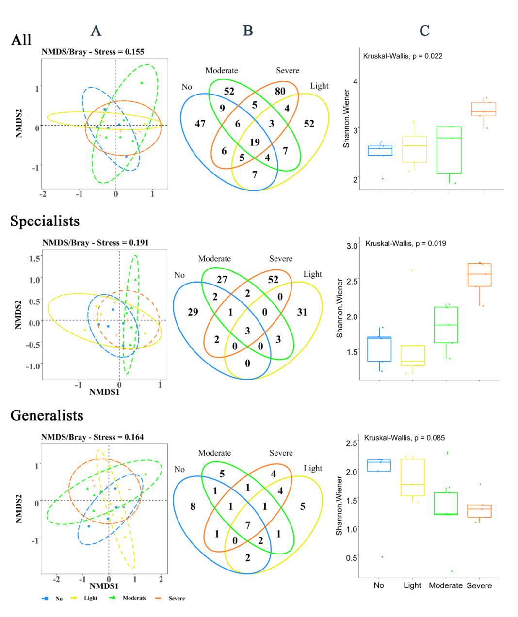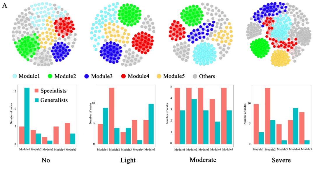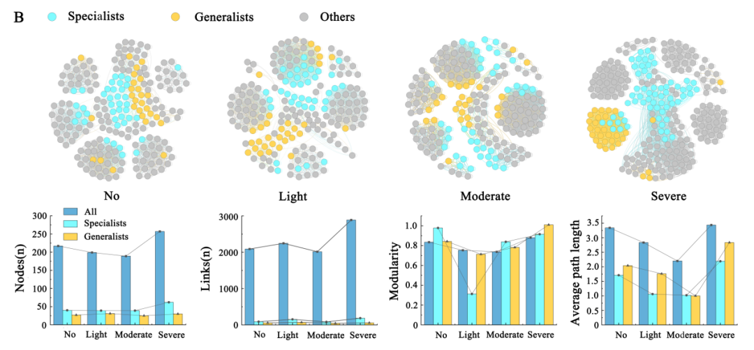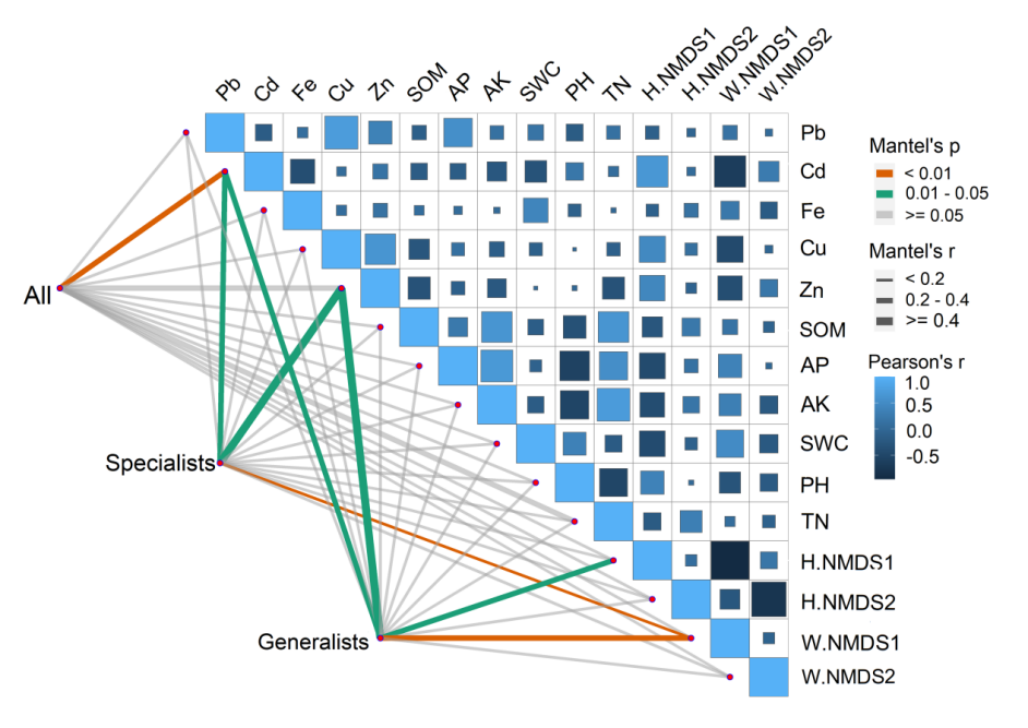 研究结果发现镉污染的增加导致AMF特化种多样性的增加,而泛化种的多样性则呈明显减少。特化种的群落组装是由确定性过程主导的,而泛化种的群落组成是由随机过程主导的。在土壤镉污染的情况下,特化种在维持AMF网络稳定性方面发挥更为重要的作用。总体而言,镉污染影响了城市绿地生态系统中AMF的生态过程,但对不同AMF类群(特化种和泛化种)的共存过程和网络稳定性的影响存在明显差异。该研究进一步加深了我们对城市绿地中微生物对重金属污染的响应的认识,为发展城市绿地的生物修复实践提供了科学指导。