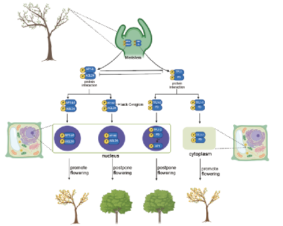 花期调控通常由转录因子或表观遗传修饰来控制。转录异构体在花期调控中发挥重要作用。该研究在桂花花期调控网络关键基因OfAP1(存在同源基因OfAP1-a/OfAP1-b)和OfTFL1中发现了转录异构体。OfAP1-b生成了一个完整长度的OfAP1-b1转录异构体,以及一个缺乏C-末端结构域的OfAP1-b2转录异构体。虽然OfAP1-b2缺失激活域,但具有完整的K结构域,使其可以正常形成异源二聚体。OfAP1-b2通过与OfAGL24结合形成无功能和功能性异源二聚体,与OfAP1-b1竞争。因此,OfAP1-b1促进开花,而OfAP1-b2延迟开花。OfTFL1产生了位于不同细胞定位的两个转录异构体:OfTFL1-1定位于细胞质中,OfTFL1-2定位于细胞核中。当OfTFL1-1与OfFD结合时,其蛋白复合物不能进入核内抑制开花效应基因OfAP1的表达,导致早开花。相反,当OfTFL1-2与OfFD结合时,蛋白复合物进入核内抑制OfAP1的表达,导致较晚开花。OfAP1和OfTFL1的组织特异性表达和跨物种的功能保守性检验支持这一新模型在调控开花中的有效性。