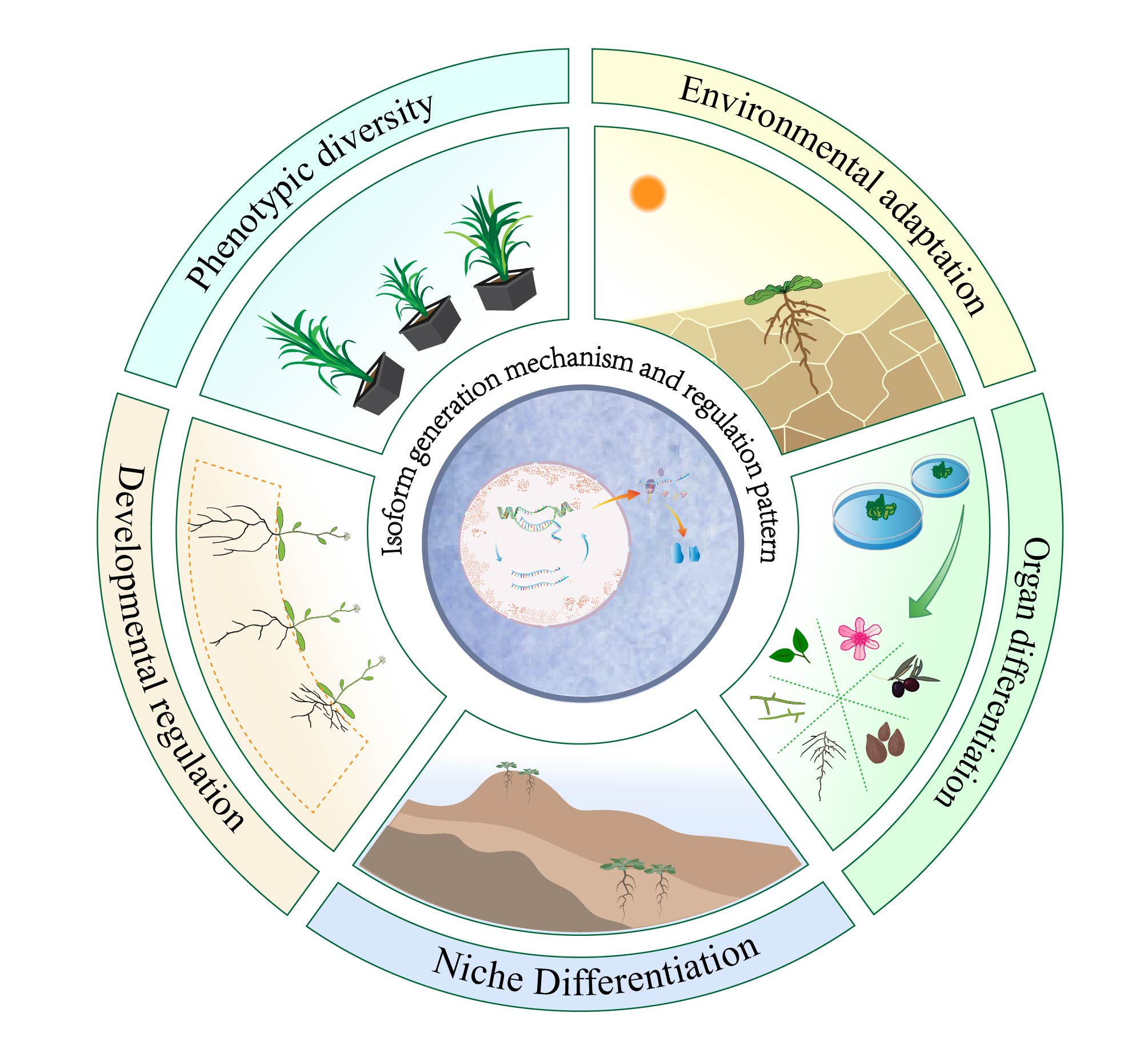 团队在前期发表在《Annals of Botanay》桂花异构体调控开花时间的论文基础上进一步全面地总结了PIs在植物中的起源、功能、调控模式,并讨论了它们对未来分子生态学和分子生物学研究的挑战和机遇。蛋白质异构体(PIs)是通过替代剪接(Alternative Splicing, AS)、替代多聚腺苷酸化(Alternative Polyadenylation, APA)、替代起始(Alternative Initiation, AI)和核糖体移码(Ribosomal Frameshifting, RF)事件产生的同一基因的多个蛋白质版本。综述文章认为PIs的存在不仅显著增加了基因组信息的复杂性,而且极大地丰富了调控网络,增强了其灵活性。它们可能在表型多样性、生态位分化和物种形成中发挥重要作用,从而扩展了分子生物学及分子生态学的研究维度。文章进一步总结了植物中PIs的代表性例子,并根据现有研究归纳了它们的调控模式,包括差异亚细胞定位、差异互作结构域、蛋白质复合体的差异降解速率以及不同异构体之间的竞争或干扰。文章最后提出了未来研究PIs的关键领域,包括使用冷冻电镜和X射线晶体学分析PIs的三维结构特征、利用空间转录组学确定PIs的时空表达模式,以及研究PIs在植物代谢调控、环境适应、器官发育和物种形成中的分子机制。