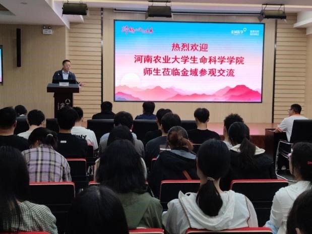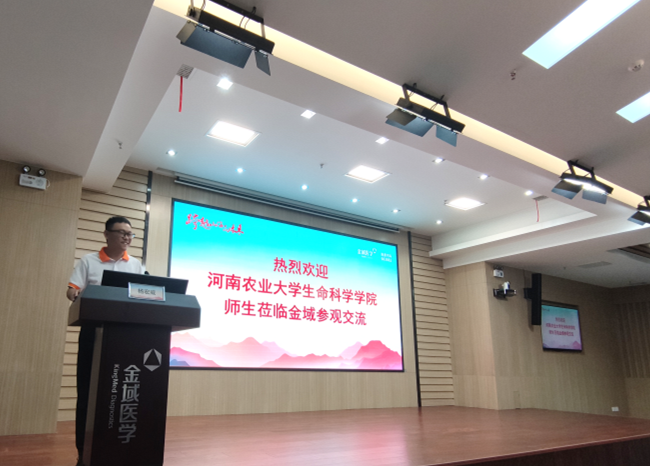 (本网讯 马培培)为深化产教融合,促进教育链、人才链与产业链的有机衔接,2025年5月7日,在院党委书记刘国兵带领下,生化系主任王潇然,教师王燃、徐玉芳、李瑞琪、马培培及2022级生物技术专业学生代表共同前往郑州金域临床检验中心,以生物技术专业综合实训为契机开展访企拓岗。郑州金域副总经理杨宏威及企业技术专家团队对师生一行给予了热情接待。