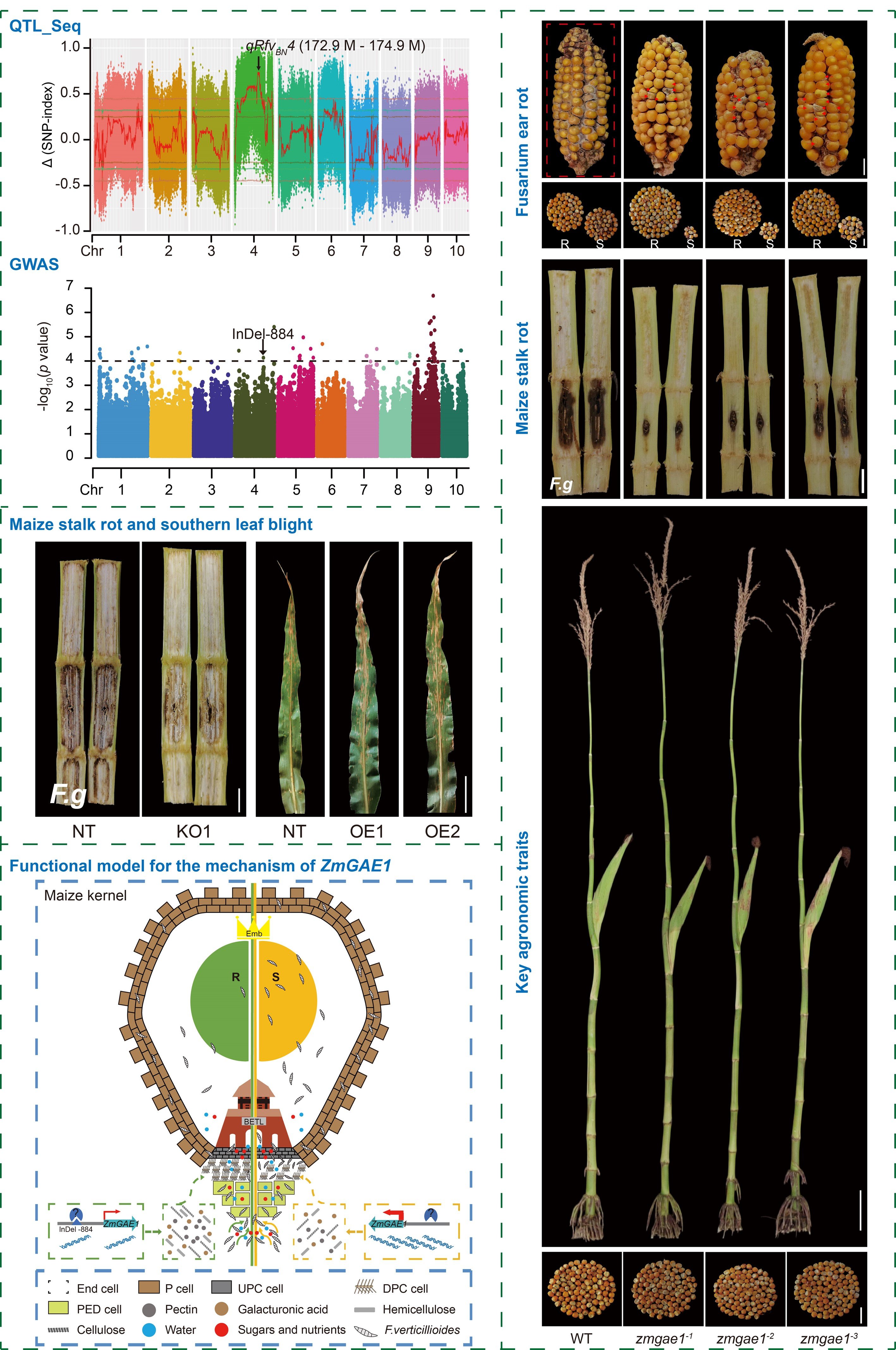 该研究结合QTL-seq 与关联分析,鉴定到一个编码UDP-D-glucuronate 4-epimerase 1的基因ZmGAE1,该基因在半乳糖醛酸合成过程中发挥关键作用。随后,证实ZmGAE1启动子中141-bp的插入序列为调控镰孢菌穗腐病(Fusarium ear rot,FER)抗性的自然变异位点,可以降低ZmGAE1表达量并增强对FER的抗性。进而,通过过表达株系、基因编辑敲除株系及EMS突变体验证了ZmGAE1负调控玉米对FER的抗性。与野生型相比,zmgae1突变体籽粒的半乳糖醛酸和果胶含量显著增加,提升了籽粒基底down-placenta chalaza (DPC)区域细胞的致密程度,从而提高玉米对穗腐病的抗性并显著降低伏马毒素的积累水平。对大刍草、玉米地方种和现代玉米的单倍型分析表明,ZmGAE1抗病单倍型被育种家选择保留并富集在携带热带血缘的CML和P群等部分现代自交系中。令人振奋的是,通过基因编辑敲除ZmGAE1不仅提高了玉米对穗腐病、茎腐病、小斑病等多种病害的抗性,而且通过增强植株的茎秆强度提高了抗倒伏能力,且对产量性状未造成不利影响。因此,该基因可以作为基因编辑改良玉米综合抗性的重要靶标。综上所述,研究系统解析了ZmGAE1负调控玉米穗腐病抗性的分子机制,更为育种工作者提供了切实可行的穗腐病抗性改良方案。