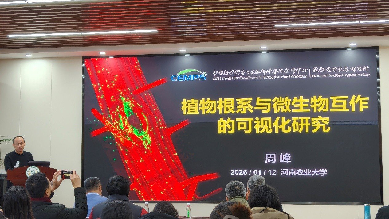 周峰研究员以“植物根系与微生物互作的可视化研究”为题作了报告。他聚焦植物根系免疫与土壤微生物互作这一前沿方向,生动介绍了其团队在建立互作可视化技术体系、解析关键信号通路等方面取得的重要进展,展示了如何利用先进成像与分子生物学手段揭示根系与微生物间的动态互作过程。