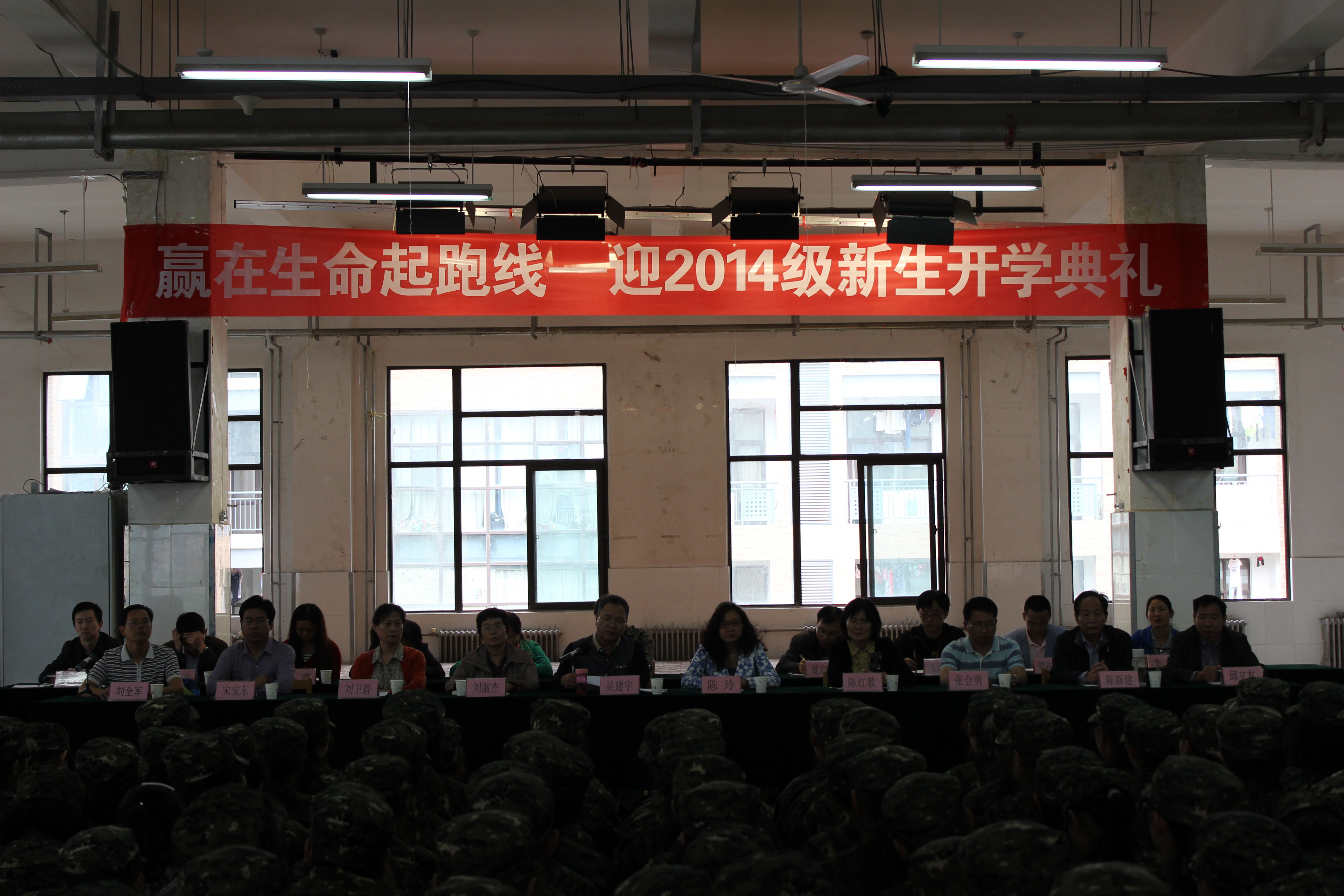 在龙子湖校区餐厅三楼大学生活动中心举办“赢在生命起跑线——迎2014级新生开学典礼”,院党委书记陈玲,院长吴建宇,院党委副书记刘全军,副院长陈红歌、刘淑杰,院团委书记程城,学院教师代表和新生班主任出席典礼,全体2014级新生参加此次大会,刘全军主持典礼。