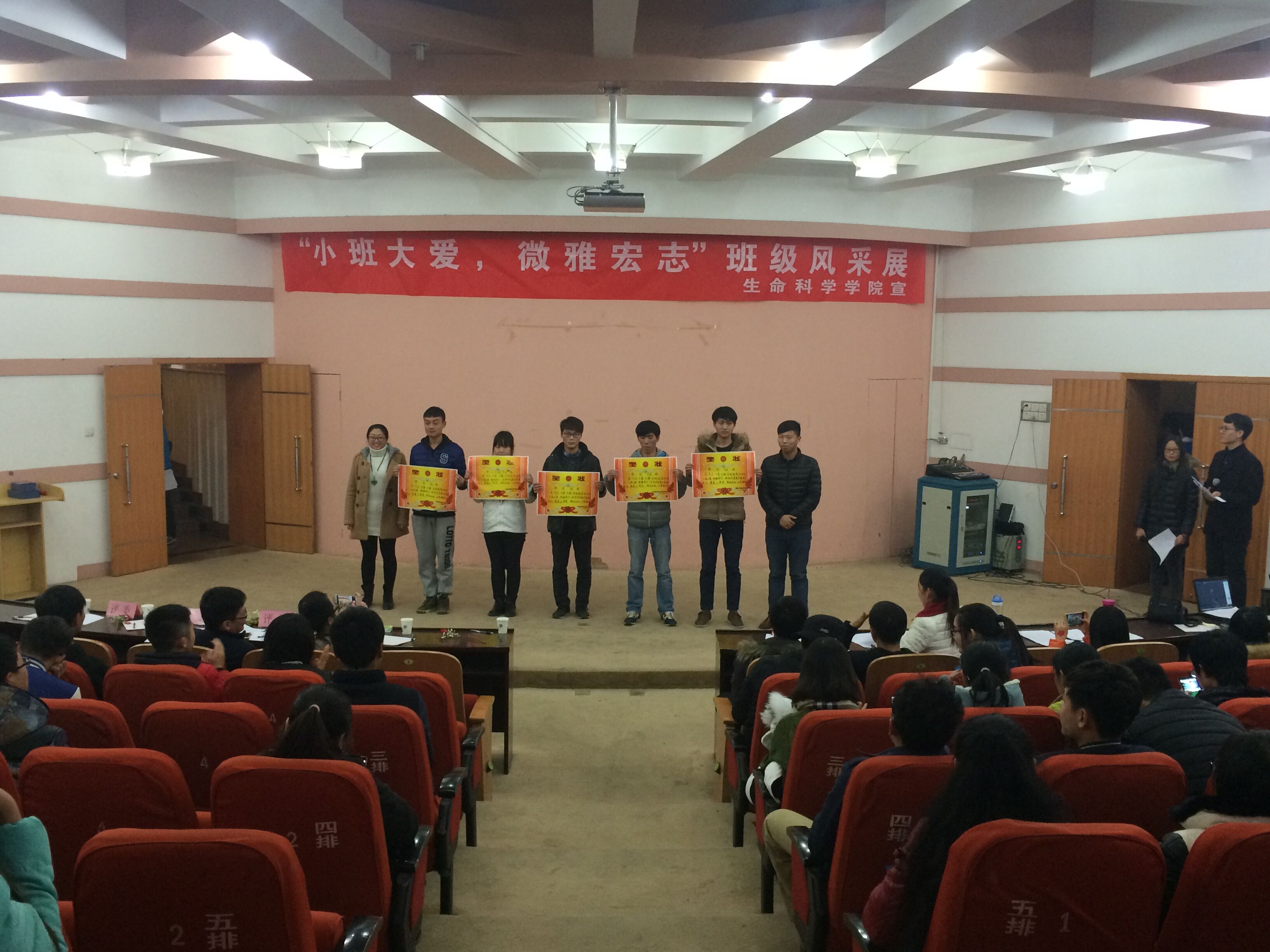 各班都积极配合。在班级风采展示中,各班都将最好的精神面貌展现给大家。各班级表演的节目形式多种多样,有大合唱、歌舞串烧、吉他弹奏、T台秀、舞台剧、话剧等,同学们热情高涨,现场欢呼声、掌声不断。经过激烈角逐,13级生物工程四班、14级生物工程二班获得一等奖,13级生物工程绍骙班、13级生物科学二班、14级生物技术三班获得二等奖,13级生物科学三班、14级生物工程一班、14级生物工程三班、14级生物工程五班、14级生物科学四班获得三等奖。刘全军对学生寄予了深切厚望,称赞大家充分展现了班级的风采,鼓励同学们在今后的学习中多参加集体活动,为班级做贡献。