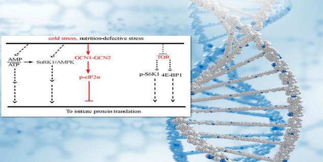 植物适应逆境胁迫的途径有很多种,但之前的研究主要从基因的转录水平阐述植物适应逆境的作用机理。张海荣科研团队通过图位克隆的方法,鉴定并克隆了拟南芥AtGCN1。AtGCN1编码酵母GCN1的同源物,其蛋白与拟南芥GCN2互作调控蛋白激酶GCN2的活性,在SA、UV、冷胁迫或氨基酸饥饿下使蛋白翻译起始因子eIF2α磷酸化。在突变体atgcn1中,由于AtGCN1的功能缺失,GCN2活性丧失而不能使eIF2α在逆境胁迫下发生磷酸化,在低温胁迫下其蛋白翻译水平高于野生型,可能导致消耗了过多能量,因此与野生型相比atgcn1对低温胁迫更敏感。该工作阐明了逆境胁迫中植物蛋白翻译水平的调控机制及其在植物抗逆,尤其是抗低温胁迫中的重要性,为植物抗逆研究提供了新思路。
