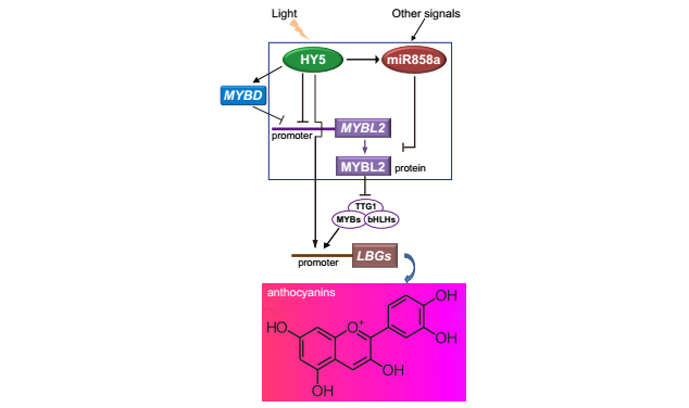 Anthocyanin(花青素)是一类广泛存在于植物中的类黄酮类化合物,具有抵抗生物及非生物胁迫以及调控植物生长发育等功能。作为一种天然的抗氧化营养型食用色素,花青素在食品、化妆品和医药产业等领域具有较大的应用潜力。植物体内花青素的合成在基因转录水平受到复杂网络的调控,然而在转录后水平的调控机制仍不清楚。张会勇科研团队通过一系列分子和生化研究证明非编码小分子RNA(microRNA858a)花青素合成途径的一个正调控因子。MiR858a通过抑制花青素合成负调控因子MYBL2基因的翻译,促进晚期合成基因的表达,从而使花青素在植物体内高水平积累。此外,光形态建成调节因子HY5能够激活miR858a并抑制MYBL2基因的转录。该工作对于植物体内次级代谢调控机制以及环境因素如何通过miRNA协同调节植物生长发育研究提供了新思路。