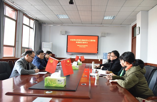 生物科学、生物技术、生物工程人才培养理念,培养方案,办学特色等。唐伟斌教授介绍了邢台学院生物科学与工程学院办学情况、学科建设、专业建设等。双方就专业建设与发展、教学科研团队建设、实验室教学与管理等方面进行了广泛的讨论和交流,并希望双方在今后进一步加强交流与合作。(文/图 张国只)