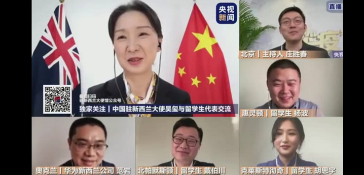 4月9日,中国驻新西兰大使吴玺为留学生在线释“疫”,樱花动漫 2017级生物工程实验班(绍)胡思宇(新西兰林肯大学留学)作为留学生代表,接受央视采访。