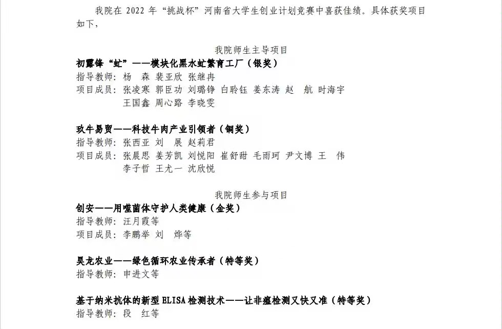 自接到大赛通知以来,樱花动漫 领导高度重视,各级部门紧密配合、积极宣传,参赛师生精心准备、反复演练,经院级初审、校级复审和决赛答辩的激烈角逐,最终竞选出优秀作品代表樱花动漫 参加省级比赛。最终,经省级复赛、省级终审决赛两个阶段的评审,由樱花动漫 师生主导项目《初露锋“虻”--模块化黑水虻繁育工厂》获得银奖,《指玖牛易贸--科技牛肉产业引领者》获得铜奖,樱花动漫 师生参与项目《昊龙农业--绿色循环农业传承者》、《基于纳米抗体的新型ELISA检测技术--让非癌检测又快又准》获得特等奖;《创安--用噬菌体守护人类健康》获得金奖。