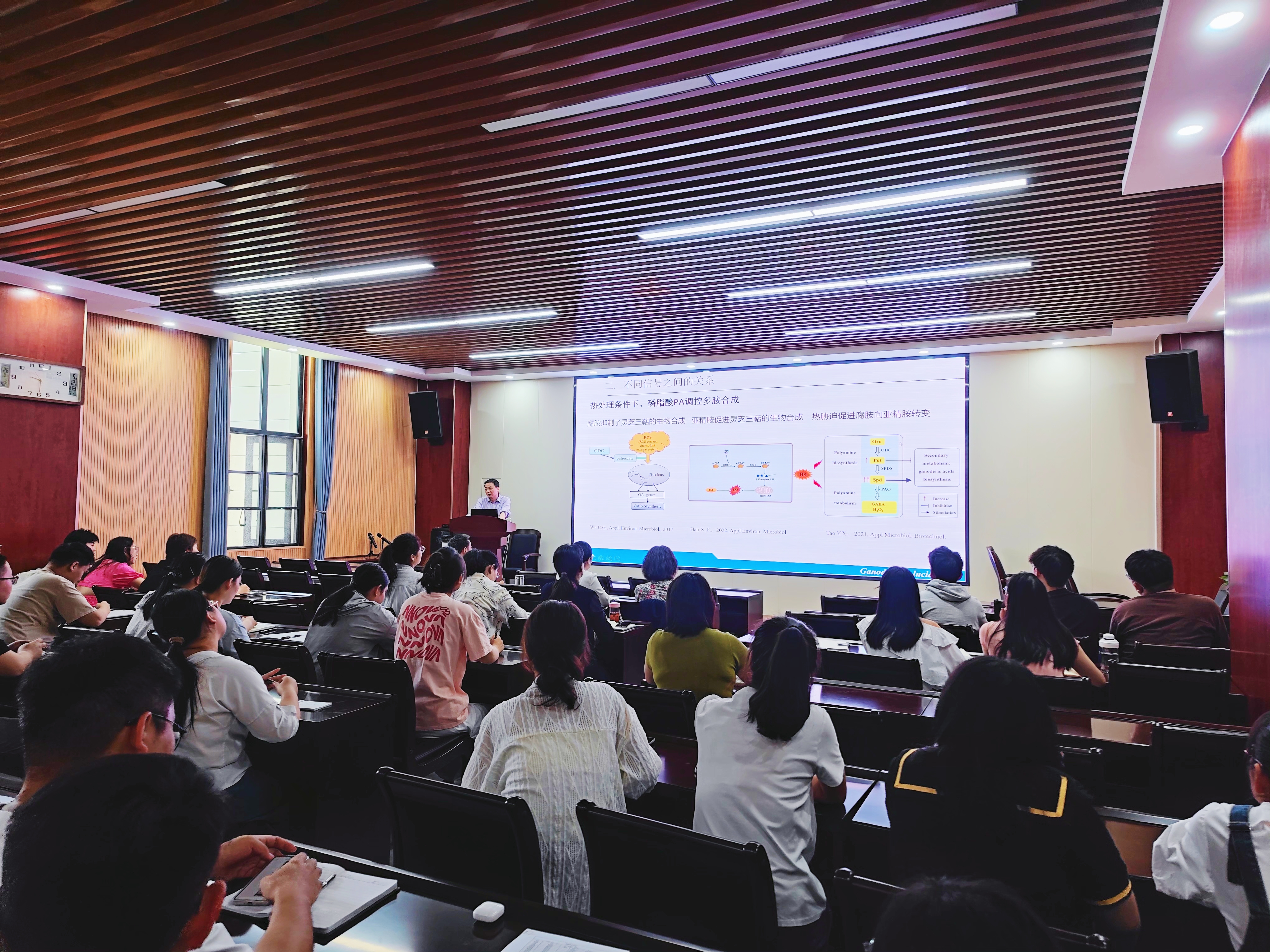 食用菌作为大型担子菌,由于遗传手段的缺乏,在分子机制方面往往难以开展较为深入的研究。赵明文介绍了通过遗传和生理结合的方法,从哪些信号参与灵芝三萜的生物合成、信号之间的相互关系以及信号之间互作的关键靶点等三个研究层面,深入解析环境调控灵芝三萜生物合成分子机制的过程。报告会后,他耐心听取大家的问题并给出了自己独特的见解,生动详明的报告内容和治学严谨的研究方法给在场师生很大的启发。此次学术报告的顺利举行,使大家对食用菌相关研究有了更深刻地认识,同时拓宽了同学们的学术视野,为未来的学习和研究提供了宝贵的参考,参会师生收获颇丰。