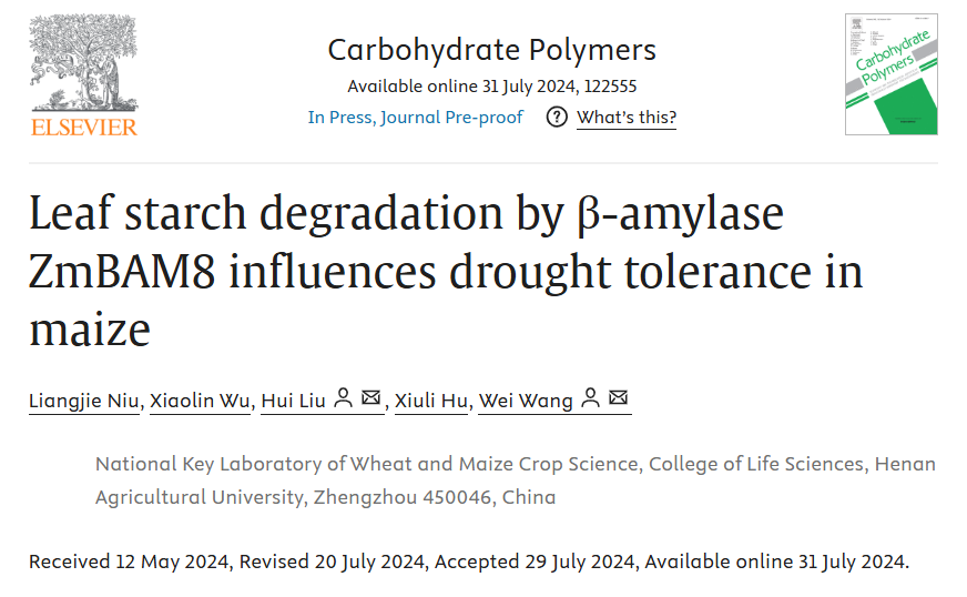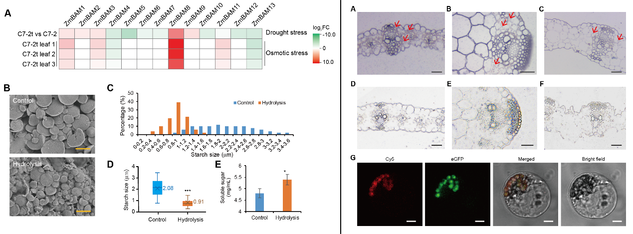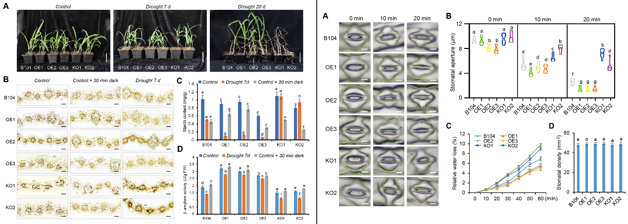 该研究证明,ZmBAM8介导的叶片淀粉降解通过增加可溶性糖含量、减少气孔的水分损失从而提高玉米的耐旱性,这对于深入理解玉米等C4作物耐旱的分子机制、耐旱分子育种具有重要的科学意义和价值。
