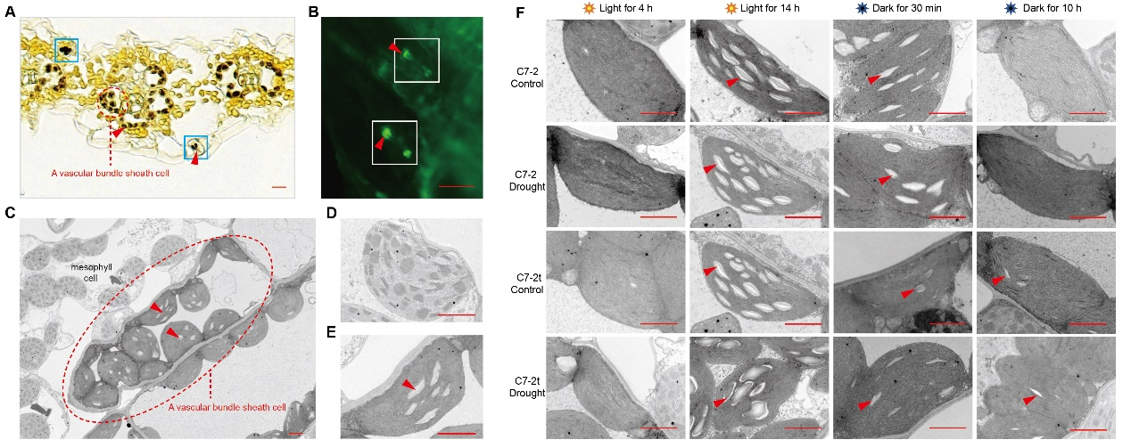 该研究表明,玉米维管束鞘细胞和叶肉细胞的叶绿体结构明显不同,淀粉主要存在于维管束鞘细胞的叶绿体中,气孔保卫细胞中也存在(图1)。干旱胁迫下,玉米维管束鞘细胞的淀粉在光照下显著减少,导致可溶性糖增加。β-淀粉酶ZmBAM8基因主要在叶片的维管束鞘细胞中表达,干旱胁迫诱导其高水平表达,ZmBAM8蛋白定位于叶绿体,这与叶片淀粉周转的组织和细胞部位一致。另外,ZmBAM8重组蛋白具有典型的β-淀粉酶活性,可以体外高效降解玉米叶片淀粉、产生可溶性糖(图2)。