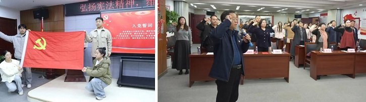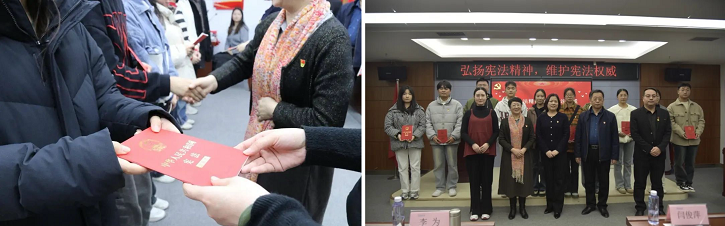在分享交流环节,校政策法规办公室主任闫俊萍、植物系教工党支部书记袁志良、学生党员代表成家俊和上海市海华永泰(郑州)律师实务所党支部副书记、律师吉赞赞先后发言。他们以自身经验将党建与宪法相结合,深入浅出地探讨了法治精神的重要性及其实践路径,使大家对宪法与法治有了更深入的理解。活动最后,现场举行了庄严的入党宣誓仪式,并向青年学生党员代表赠送了《宪法》读本。